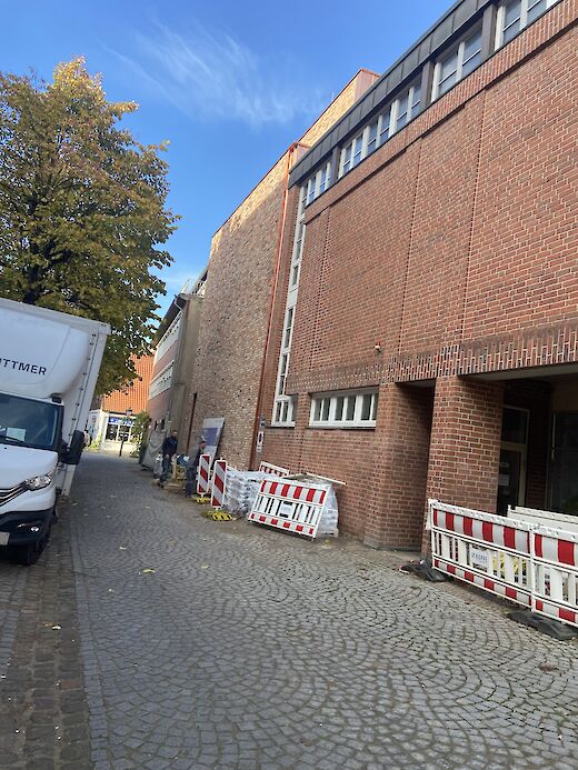 Nun ist der Kantbau schon von weitem als Baustelle erkennbar. Mit dem Kran beginnen die Hochbauarbeiten für den Erweiterungsbau. Noch sind nur die Umrisse des Kellergeschosses mit den Archivräumen zu erkennen. Doch bald schon aber wird der Bau in die Höhe wachsen.